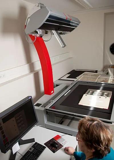 工作人員使用賽數(shù)OS14000掃描儀掃描報紙