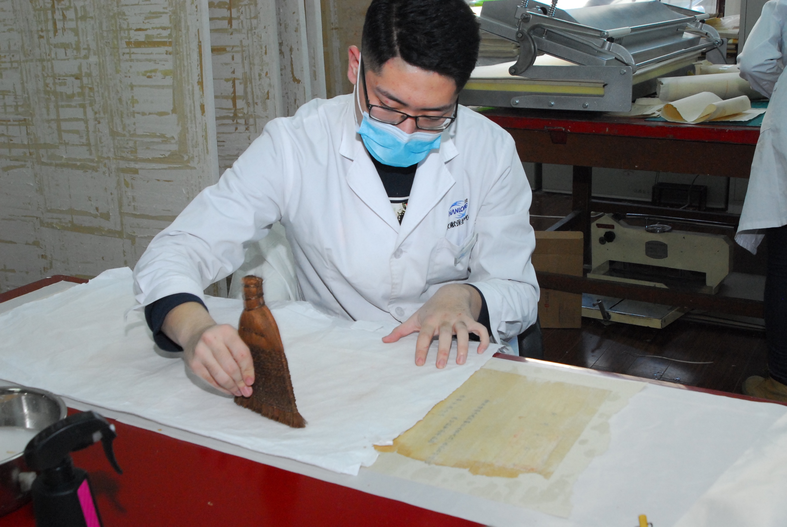 制作好漿糊,選好配紙,就進(jìn)入了正式的文獻(xiàn)修復(fù)階段。文獻(xiàn)修復(fù)有兩種方法,一種是全手工修復(fù),另一種是使用紙漿補(bǔ)書(shū)機(jī)修復(fù)。文獻(xiàn)修復(fù)中最常遇到的是修補(bǔ)破洞,常用到的工具也就是一張紙、一支毛筆、一碗漿糊。具體步驟為用沾上漿糊的毛筆在破洞處涂刷,將補(bǔ)紙快速粘在破洞上填補(bǔ)破洞。原則上,先補(bǔ)大洞,后補(bǔ)小洞。