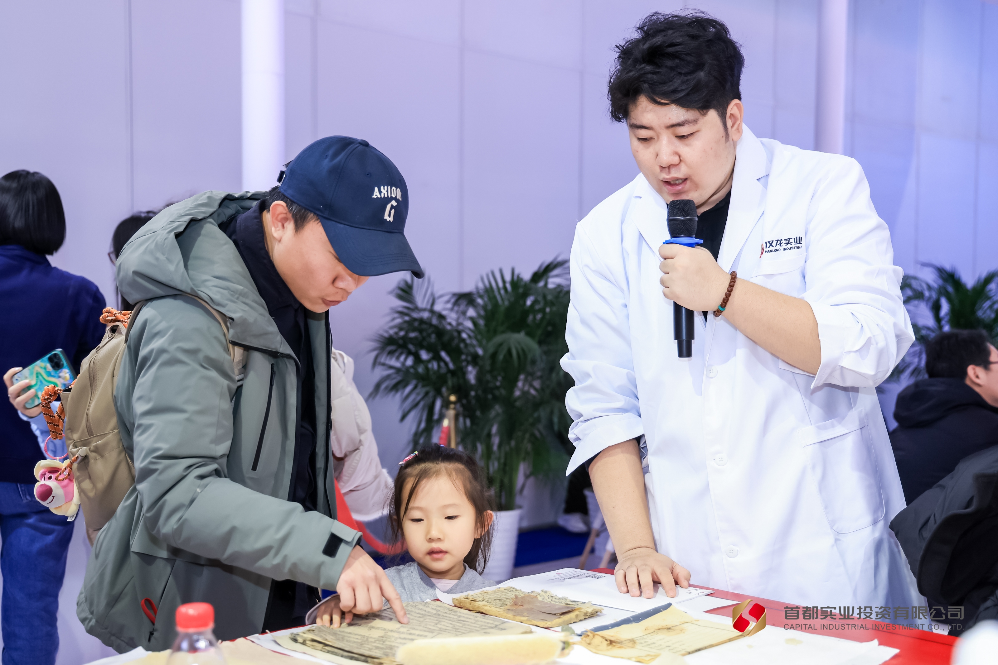 文保部副經(jīng)理郝文正,是漢龍實(shí)業(yè)一位資深的紙質(zhì)文獻(xiàn)修復(fù)師,擅長各類紙質(zhì)文獻(xiàn)修復(fù)。他雖年輕,卻已與文獻(xiàn)修復(fù)相伴 11 年之久,曾榮獲全國檔案工匠技能(檔案修復(fù))大賽三等獎。身著 “白大褂” 的他,在現(xiàn)場時而埋頭指導(dǎo)小朋友們動手體驗(yàn),時而拿起麥克風(fēng)為觀眾講解文獻(xiàn)修復(fù)科普知識。他表示,文獻(xiàn)修復(fù)師就如同文獻(xiàn)的 “醫(yī)生”,通過巧施匠心、妙手回春,能夠讓受損的紙質(zhì)文獻(xiàn)重現(xiàn)生機(jī),延續(xù)壽命。